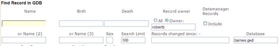 You can restrict your search to a particular database. Normally you’ll combine this with a particular record owner: here, for example, we want only records from my “barnes.ged” database.