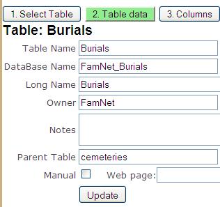 Because tables are not defined every day, and the process is a bit complicated, it is likely that most tables are defined by system or group administrators, so for these users there are a few extra fields allowing them to define a table and nominate somebody else to be the table owner. For example, here the table of PreTreaty Settlers is being defined by me for user Lyndear. Notice the extra lines, allowing me to specify the owner group, and the owner user. This table can now be managed by user lyndear or by the FamNet administrator (that’s me).