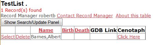 § For searching the family name must be given exactly, but the given name need merely contain the text searched for. Thus searches for “R Barnes” and “Rob Barnes” will find the record for “Barnes, Robert Arthur”.